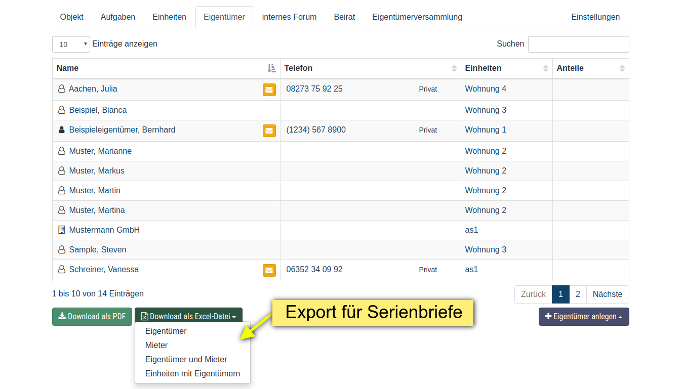 Wir haben die Exportfunktion für Serienbriefe erweitert und vereinfacht. Jeder Export enthält jetzt immer den richtigen Namen und eine Briefanrede, zusätzlich werden die Miteigentumsanteile exportiert.