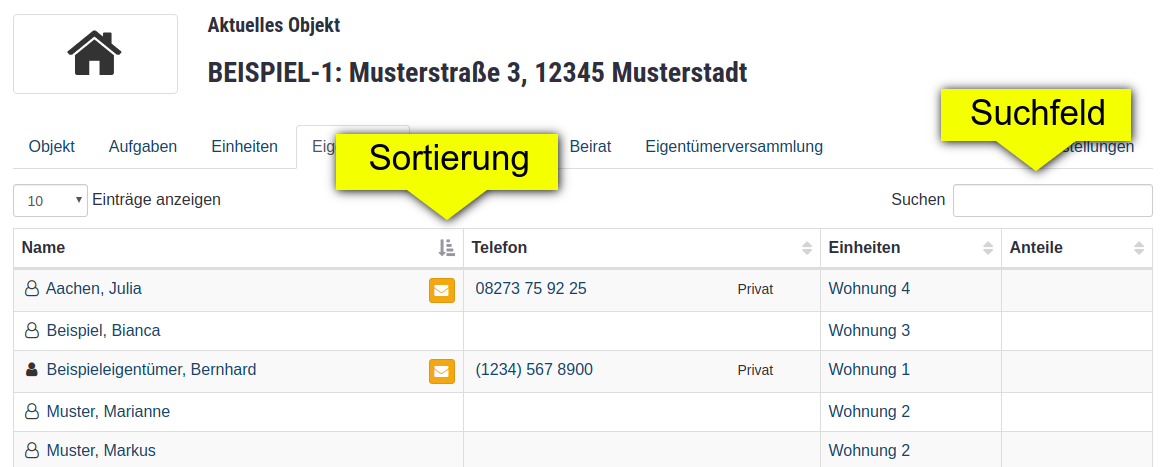 Sortier- und Suchfunktion für Einheiten und Eigentümerliste