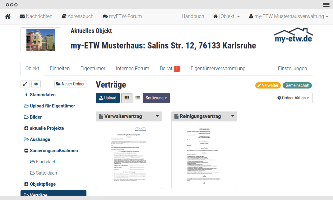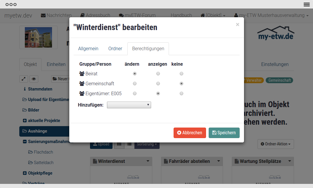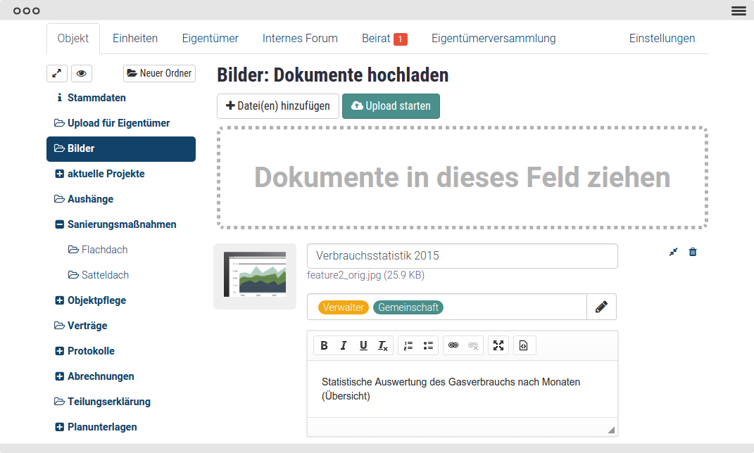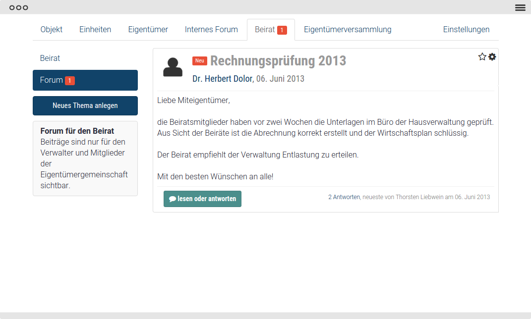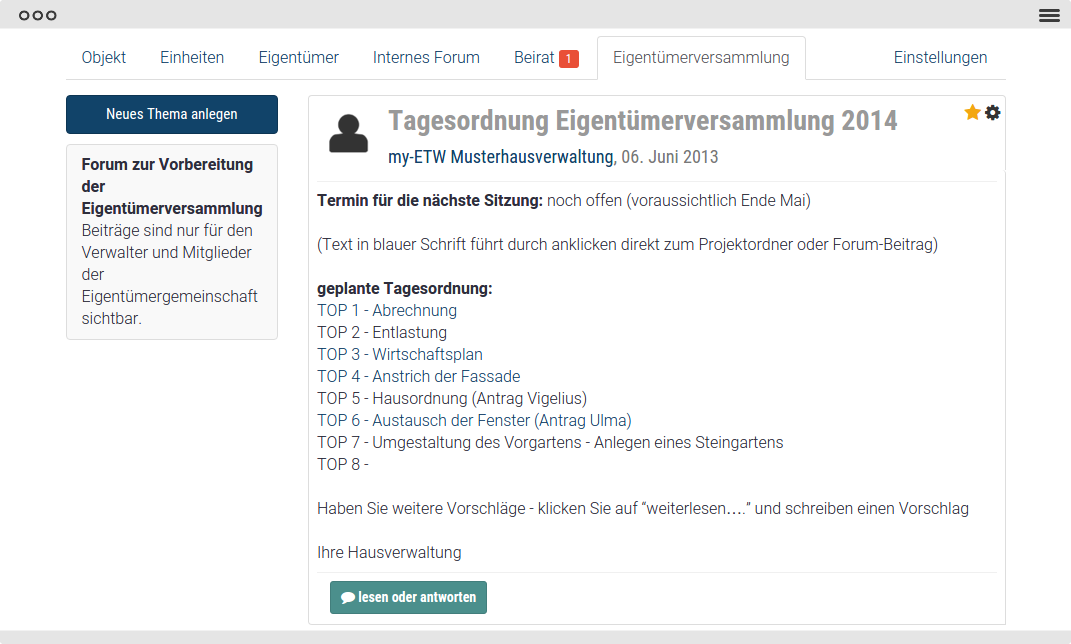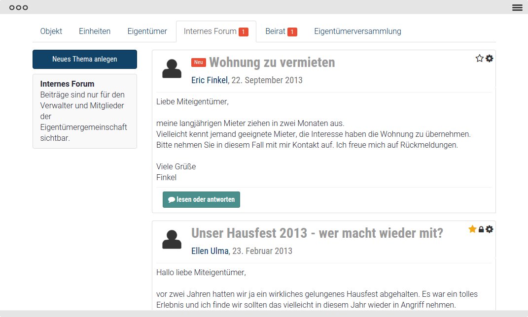Jedes Objekt in my-ETW verfügt über geschlossene Forenbereiche für Eigentümer, den Beirat sowie für die Vorbereitung der nächsten Sitzung.
