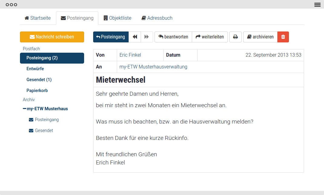 Jeder Verwalter erhält eine externe E-Mail-Adresse (name@my-etw.de), unter der Nachrichten und Anhänge als E-Mail verschickt und empfangen werden können.